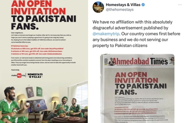 In its new ad, MakeMyTrip has given consolation offers to Pakistani fans on MakeMyTrip Homestays and Villas for when the Pakistan team loses the match today.