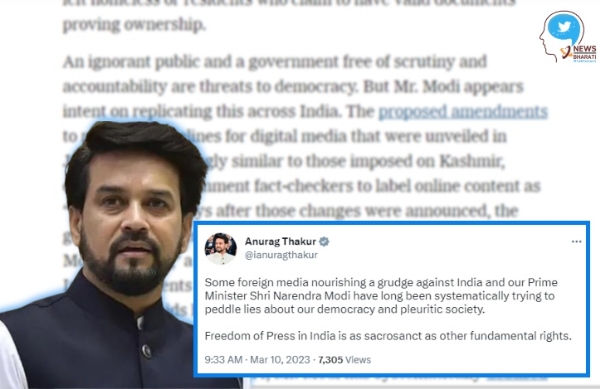 "This is in continuation with what NYT and a few other link-minded foreign media have been spreading lies about India and our democratically elected Prime Minister Shri Narendra Modiji. Such lies can't last long," he said. He asserted that the Freedom of Press in India is as sacrosanct as other fundamental rights. "Some foreign media nourishing a grudge against India and our Prime Minister Shri Narendra Modi have long been systematically trying to peddle lies about our democracy and pleuritic society. Freedom of Press in India is as sacrosanct as other fundamental rights," the minister said in a tweet.