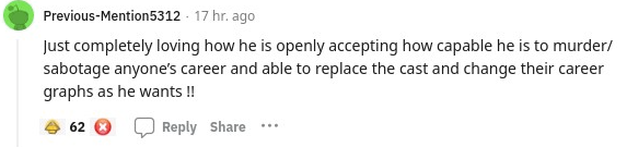 Another said, "Just completely loving how he is openly accepting how capable he is to murder/ sabotage anyone’s career and able to replace the cast and change their career graphs as he wants!!"