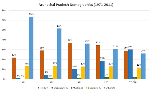 Arunachal Pradesh and Other North-East states DataTable 1 illustrates a dramatic rise in Christianity, increasing from 0.79% in 1971 to 30% in 2011. In contrast, the proportion of people following other religions (mainly Donyi Polo) has sharply declined, dropping from 63% in 1971 to 26% in 2011. This highlights the exponential growth of Christianity, driven by aggressive evangelism over the past few decades, which has significantly impacted the indigenous faiths and cultures of the Himalayan state. There is concern that the next census will show the Christian population in the state surpassing 40%.