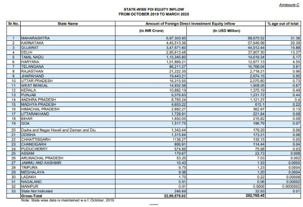 | State | FDI Inflow (INR Crore) | FDI Inflow (USD Million) | % of Total FDI |