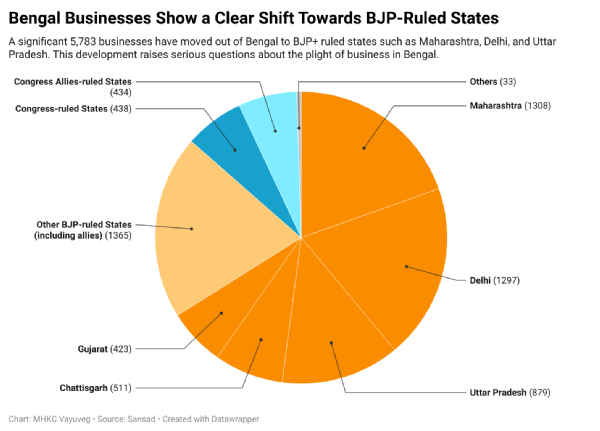 Once known for its industries and enterprise, West Bengal faces an unsettling trend: businesses are being relocated out of the state. No sensational headlines, no protests. Just the fact that 6,688 companies have shifted their registered offices out of Bengal over the past decade. The exodus, which has been accelerating since the TMC came to power in 2011, is not random. Moreover, the Mamata Banerjee government was left red-faced when these firms chose BJP-ruled states such as Maharashtra, Uttar Pradesh, Gujarat, etc, where policy is predictable and the political climate more welcoming.